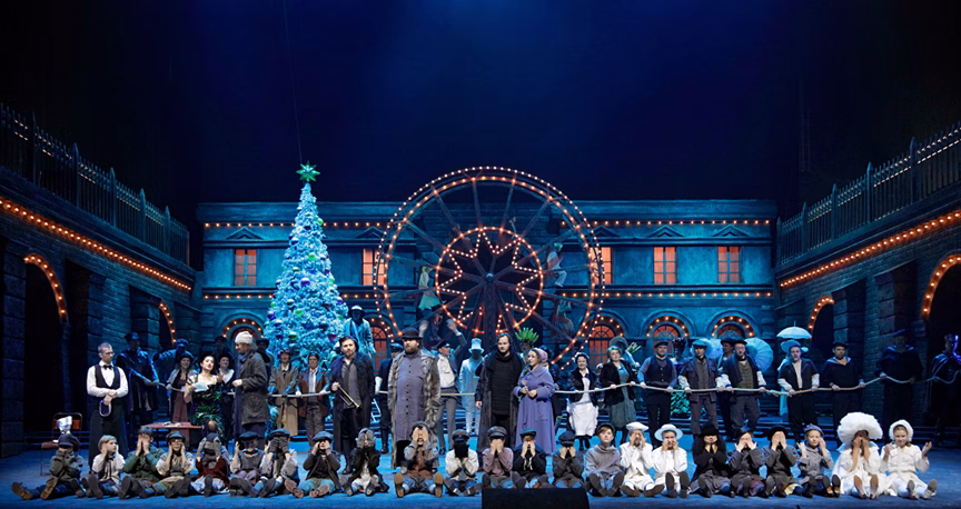 This scene takes place at the Latin quarters. The opera chorus creates an atmosphere of Christmas eve and a jolly market mood front of the café.